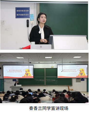随后,主讲人秦香兰同学以“坚定文化自信,推动文化自强——从哪吒形象的演变看中华文化的力量”为题,从哪吒形象切入,生动阐释了中华文化的力量。她以“哪吒”形象从传统的悲情英雄到当代影视的热血少年演变为例,指出这一形象所体现的“我命由我不由天”的抗争精神和“为民请命”的担当意识,正是中华文化精神在当代的创造性转化与创新性发展。她还结合学校开展的各类实践活动、专题讲座、国际文化交流月、海外访学项目等实例,强调新时代青年应在文化传承中树立自信,在开放包容中吸收借鉴,在守正创新中激发活力。