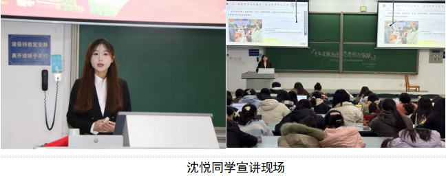 最后,主讲人沈悦同学围绕“以青春之我 担文化之责——青年学生领悟贯彻习近平文化思想的实践路径”为题,聚焦青年行动,提出具体践行建议。她指出,青年学子应从三个方面入手:一是坚持理论学习,通过政治课堂、读书小组等方式筑牢思想根基;二是体验文化魅力,积极参与书法、戏曲、红色教育基地参观等活动;三是拓展国际视野,在交流互鉴中传播中华文化,如海外留学期间开展非遗推广等项目。她呼吁大家以“有理想、有本领、有担当”为目标,以实际行动践行文化使命,做习近平文化思想的青年传播者与实践者。