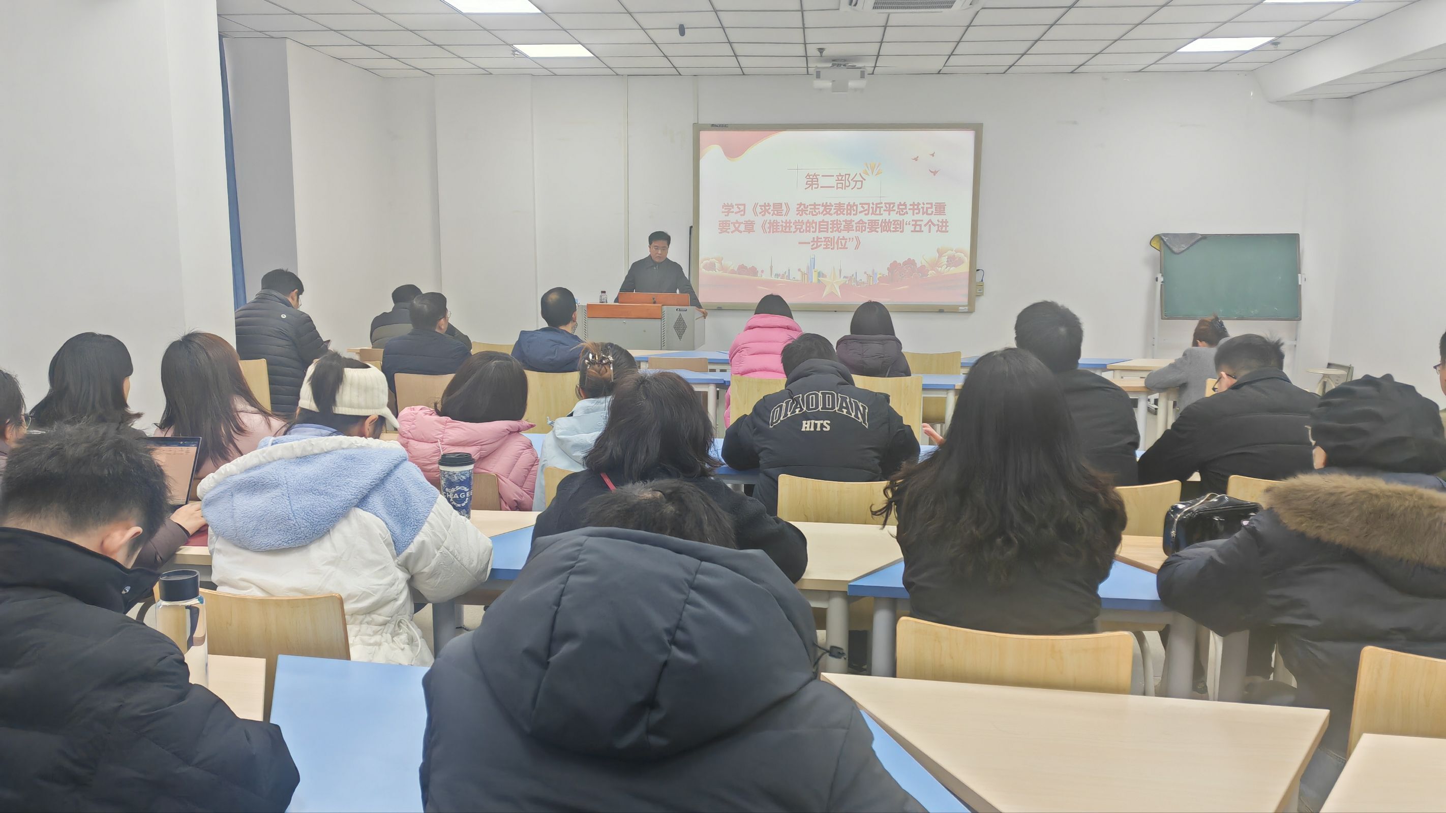 随后,支部集体学习《求是》杂志发表的习近平总书记重要文章《推进党的自我革命要做到“五个进一步到位”》。通过原文研读、交流研讨,党员们深入理解了“五个进一步到位”的核心要义,明确了推进党的自我革命要在提高认识、增强党性、规范权力运行、从严监督执纪、履行管党治党责任等方面持续发力。大家结合自身工作实际,纷纷表示要以刀刃向内的自我革命精神,勤掸“思想尘”、多思“贪欲害”,在师德修养、教学科研中践行初心使命,永葆党员先进性。