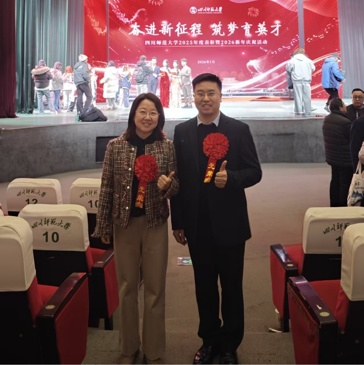 2026年1月9日,四川师范大学2025年度表彰大会暨2026新年庆祝活动隆重在成龙校区龙湖剧场举行。本次大会以"奋进新征程,筑梦育英才"为主题,全面总结学校过去一年取得的突出成就。生命科学学院教工一支部王亚男、付长坤两位教师出席大会,接受国家级一流本科课程表彰。