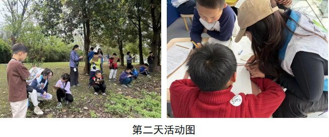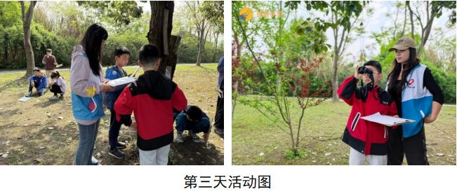 第三日,“节气雅事”主题带领孩子们走进湿地公园东侧树林。志愿者分发望远镜,引导孩子们观察鸟类,记录外形特征、体色、叫声等细节。下午,志愿者协助有困难的孩子书写生字,鼓励他们再次用比喻、拟人手法将观察转化为生动文字。从“麻雀的叫声像清脆的铃铛”到“白鹭的翅膀像飘逸的丝带”,孩子们的笔下,鸟类百态栩栩如生。志愿者用陪伴与鼓励,助力每一位孩子完成写作任务。