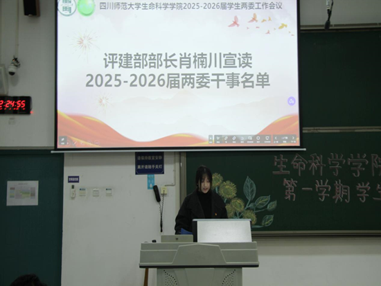 12:20,会议准时开始,全体参会人员起立齐唱学院院歌。随后,评建部部长肖楠川宣读2025-2026届两委干事名单,并代表部门向新任干事表示祝贺,同时分享工作心得与建议。