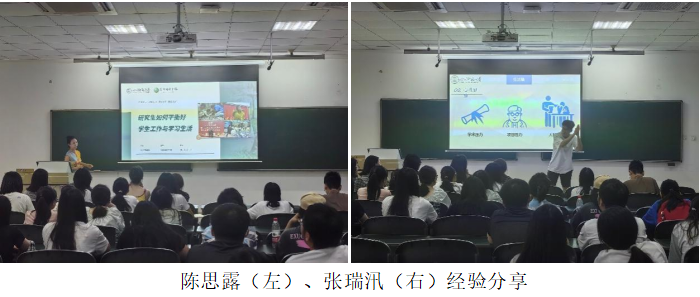 9月12日下午,学院2025年研究生新生“第一课”——高年级经验交流讲座顺利召开。学院邀请到两位优秀的朋辈学长学姐作为典型来分享他们在科研、求职等方面的经验。陈思露同学以“研究生如何平衡好学生工作与学习生活”为题,围绕“课程学习、科研训练、学生工作三条主线与新生交流,鼓励新生”抓住每一次展现自我、提升自我、锻炼自我的机会”。张瑞汛同学以“研究生生存指南”为主题,用幽默的语言抛出新生最关心的“科研方向”“文献阅读”“心理健康”等方面问题,并结合自身经历给出建议。在互动环节,两位主讲人就“怎样适应研究生生活”以及“如何平衡学生工作与学习生活”等问题与新生展开讨论,现场气氛轻松热烈。