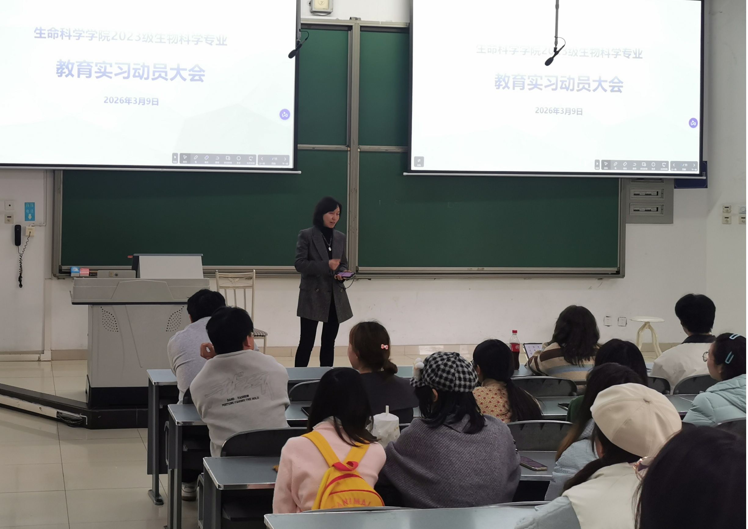 3月9日,我院2023级教育实习动员大会于成龙校区第一教学楼C206顺利举行。本次大会由2023级辅导员周梦琪主持,学院副院长马沁沁出席,2023级生物科学专业全体同学参加,旨在为即将开启的教育实习明确方向、凝聚共识。